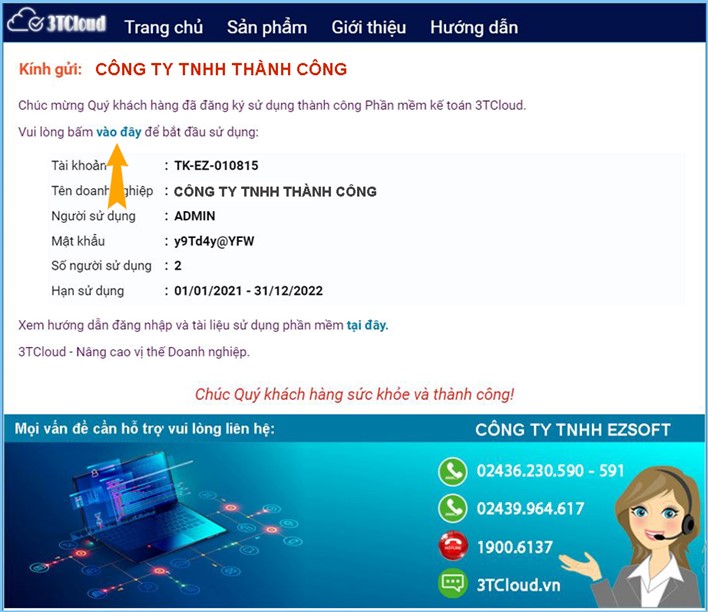 Nội dung email cung cấp thông tin đăng nhập và các thông tin về user, hạn dùng. Khách hàng kiểm tra thông tin Tên doanh nghiệp – Số người sử dụng – Hạn sử dụng đã đúng với thông tin đăng ký sử dụng 3TCloud hay không.